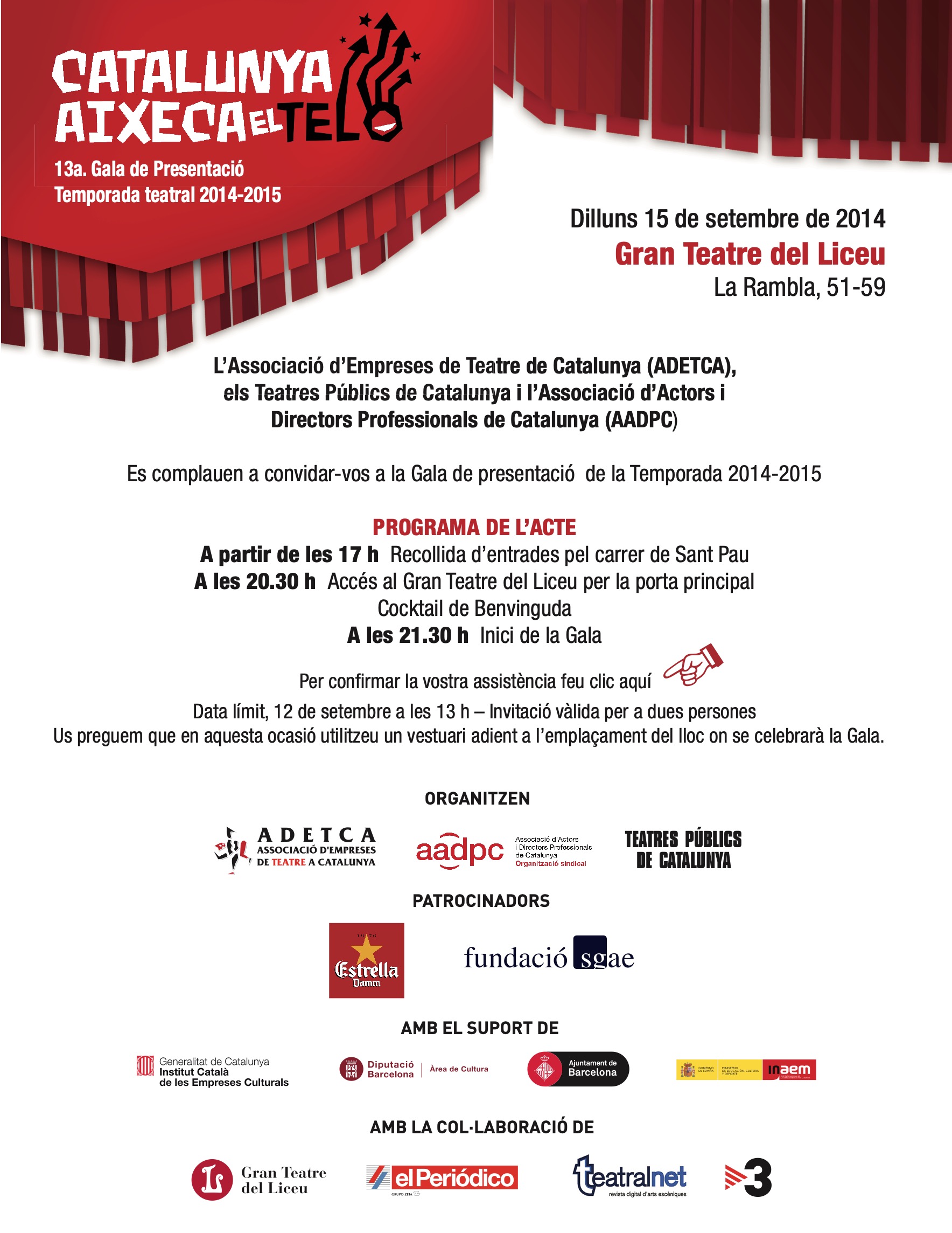 13a. EDICIÓ: Temporada Teatral 2014-2015. Lloc de celebració: Gran Teatre del Liceu. 15 de setembre de 2014